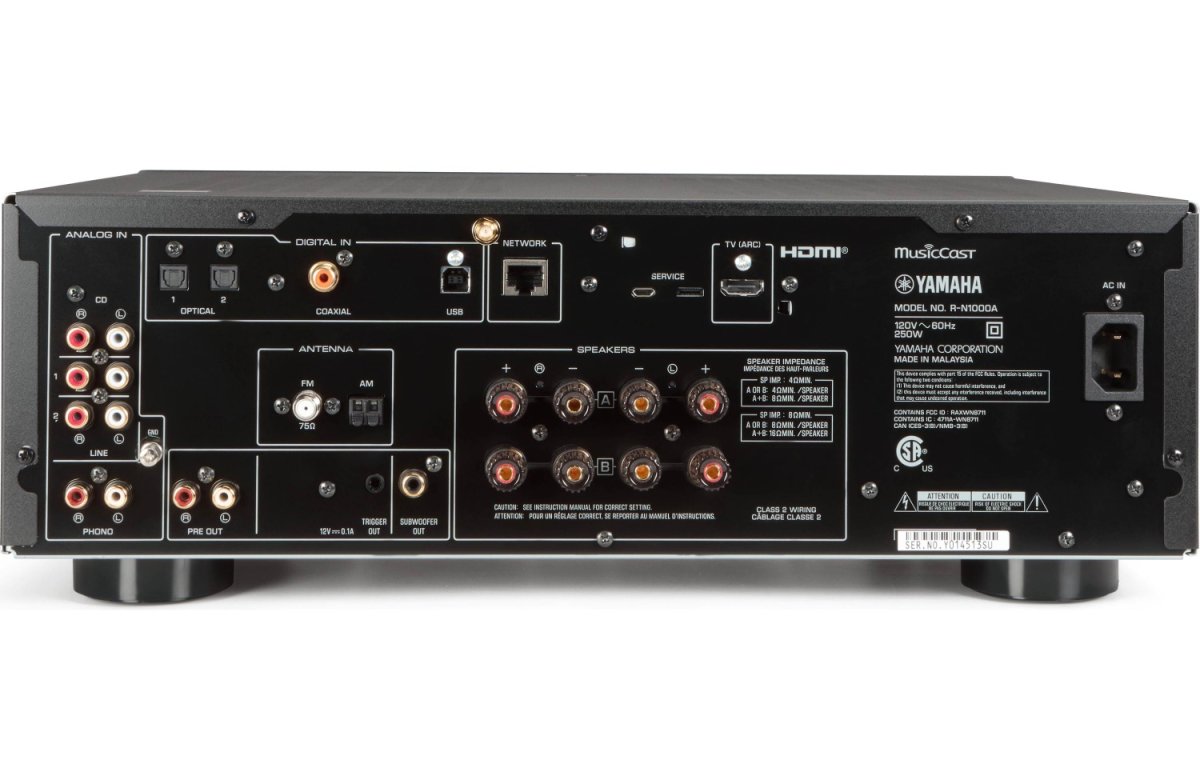 R-N1000A jest wyposażony w złącze HDMI, które obsługuje zwrotny kanał audio ARC (Audio Return Channel). Dzięki temu można wygodnie podłączyć telewizor za pomocą kabla HDMI i kontrolować podstawowe parametry odtwarzania za pomocą pilota do telewizora. Ponadto amplituner Yamaha ma jedno wejście koaksjalne i dwa wejścia cyfrowe optyczne oraz cztery wejścia analogowe (w tym jedno dla gramofonu) oraz wyjście na subwoofer aktywny. Ważne jest również, że terminale głośnikowe są pozłacane, co zapewnia wysokiej jakości połączenie i minimalizuje utratę jakości sygnału.