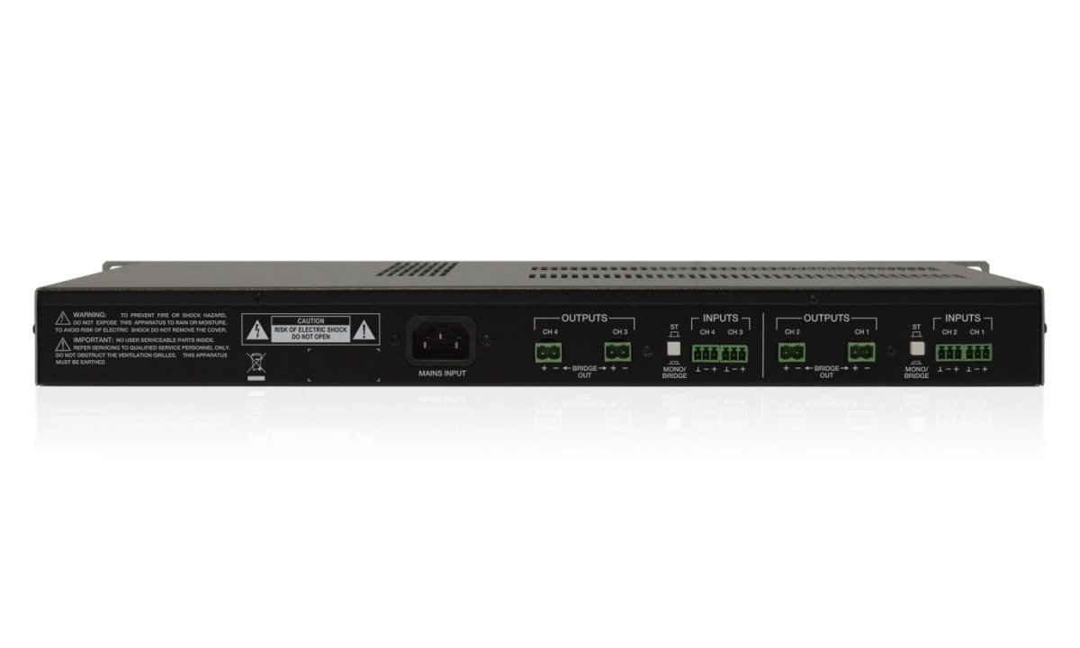- 4 analogowe wejścia audio x 4 zasilane wyjścia audio