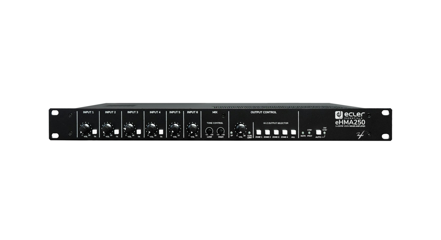 eHMA250 to mikser audio z własnym zasilaniem, wyposażony w 2 wejścia MIC, 2 wejścia MIC/LINE ST, 2 wejścia LINE ST i jedno wyjście AUX/REC. Obsługuje linie głośnikowe o niskiej (4 i 8 Ω) i wysokiej impedancji (50, 70 i 100 V), z niezależnymi 4-ZONE przełącznikami ON/OFF (ZONE 1, ZONE 2, ZONE 3 i ZONE 4), oprócz wyjścia o niskiej impedancji i wyjście pomocnicze. Zawiera także system priorytetów audio (komunikaty głosowe, sytuacje awaryjne itp.) dostępny dla 4 wejść i wbudowaną funkcję gongu (kompatybilną z mikrofonami przywoławczymi w 1 strefie), 2-pasmową regulację barwy dźwięku, automatyczny tryb gotowości, port MUTE i port Remote ( RJ45) do zdalnej regulacji głośności, kompatybilny z Ecler WPaVOL.