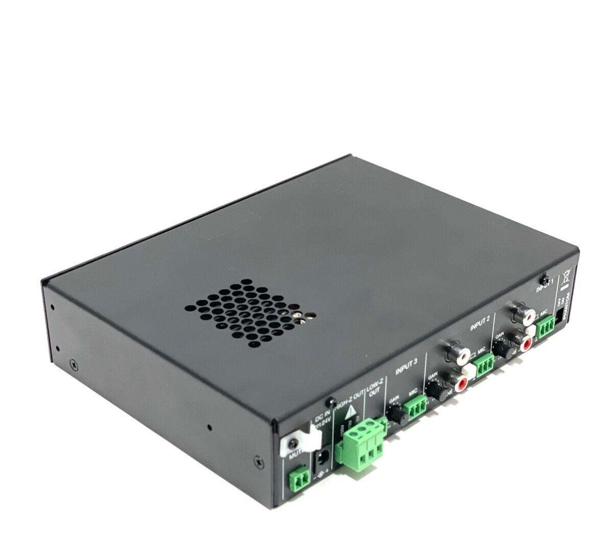 Powermikser wyposażony w wejście MIC oraz dwa wejście MIC/LINE ST. Moc 60W dla zarówno niskiej impedancji (4Ω) jak i wysokiej (70V, 100V). Obsługa audio priority, 2 regulacje tonów, funkcja auto stand-by, wyciszanie portów, zasilacz 24VDC