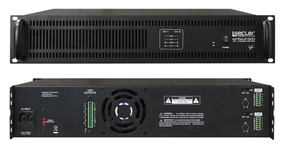 eHSA2-500 to wzmacniacz wielokanałowy z 2 wyjściami zasilanymi o wysokiej impedancji. Nowy, lekki format w obudowie 2RU, wszechstronny i niedrogi.