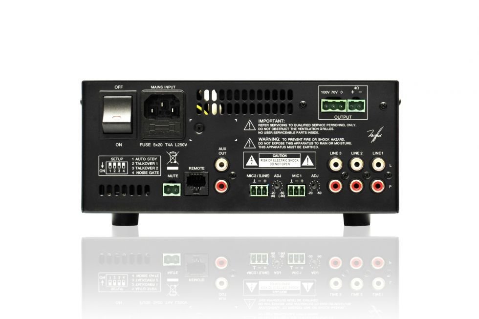 liniowe stereo, 1 wejście MIC/LINE, 1 wejście MIC, zasilanie Phantom, 3 stopniowa kontrola EQ na kanały Mic i Line, możliwość zdalnej kontroli głośności poprzez VCA. Wejście 24V dla funkcji MUTE (wyciszenie przez system P.Poż), Filtr górnoprzepustowy – 70Hz, Liniowe wyjście AUX dla