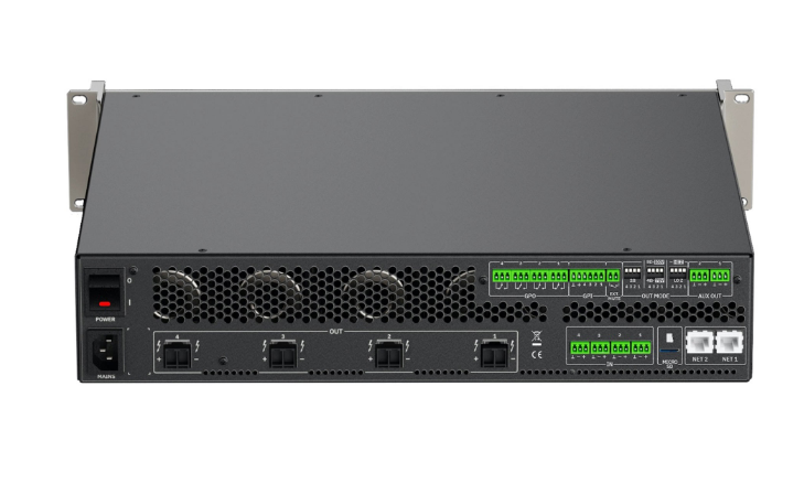 Wzmacniacz cyfrowy o mocy 4800 W z 4 wzmocnionymi wyjściami, które można niezależnie skonfigurować przy wysokiej (100/70 V) lub niskiej (8/4/2 omów) impedancji. Technologia VersaPower opracowana przez firmę Ecler umożliwia asymetryczny rozdział mocy. Maksymalna moc wyjściowa przy 2 Ω/4 Ω/8 Ω lub przy 70/100 V – pojedynczy kanał wynosi 1200 W. Odtwarzacz audio – z gniazdem microSD na lokalne pliki audio – a także generator sygnału, 2 pomocnicze wyjścia liniowe i 4 wyjścia cyfrowe Dante; Wewnętrzna matryca i przetwarzanie sygnału. Aplikacja użytkownika do zdalnego sterowania dla iOS/Android/Web. Kontrola i planowanie zdarzeń w celu automatyzacji. Tryb bardzo niskiego zużycia energii. Wymiary 482,6x88(2RU)x410 mm / 19""x3,46""x16,14"". Waga 9,3 kg. / 20,5 lb.