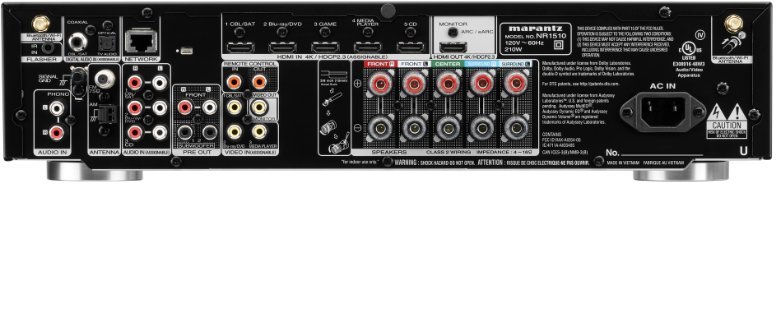 Amplituner NR1510 został wyposażony w poziomy rząd wysokiej jakości terminali głośnikowych oznaczonych kolorami, z dołączonym zestawem pasujących etykiet, które zapewniają prawidłowe podłączenie. Dołączony asystent konfiguracji dostarcza czytelne, graficzne wskazówki na ekranie, a przewodnik szybkiego startu zapewnia optymalne ustawienia dla dowolnej konfiguracji głośników.