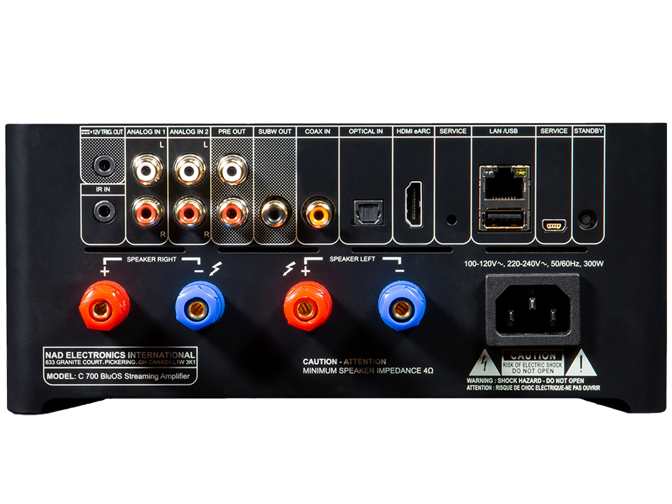 C 700 posiada dwie pary analogowych wejść RCA oraz cyfrowe wejścia koncentryczne i optyczne, umożliwiające podłączenie odtwarzaczy płyt, konsol do gier, adapterów multimedialnych i innych urządzeń. Dostępny jest również port HDMI-eARC do podłączenia telewizora HDTV z obsługą HDMI-ARC. Umożliwia to regulację głośności C 700 za pomocą pilota telewizora.