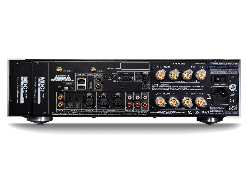 NAD Masters Series M33 oferuje imponującą listę funkcji, dzięki którym stanowi idealny element dwukanałowego systemu audiofilskiego. Generuje stabilne 200 watów mocy na kanał przy obciążeniu 8 omów lub 380 watów mocy na kanał przy obciążeniu 4 omów. Zapewnia to dużą moc i jest kompatybilny z szeroką gamą głośników. Wzmacniacz oferuje wiele wejść analogowych i cyfrowych do połączeń przewodowych, a także wiele opcji bezprzewodowego strumieniowania muzyki. Oferuje również wbudowaną korekcję akustyki pomieszczenia i opcjonalne sterowanie głosowe.