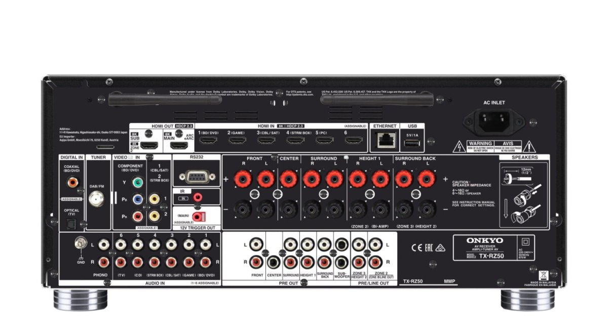 - 7 wejść HDMI (1 z przodu), 2 wyjścia (Main [eARC], Sub/ Zone 2)