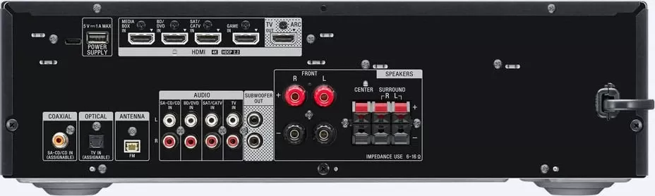Współpraca z różnorodnymi urządzeniami domowymi. Cztery wejścia HDMI i jedno wyjście, a także optyczne i koncentryczne złącza cyfrowe i analogowe umożliwiają łatwe oraz szybkie połączenie z telewizorem, odtwarzaczem UHD Blu-ray Disc™, konsolą i innymi urządzeniami.