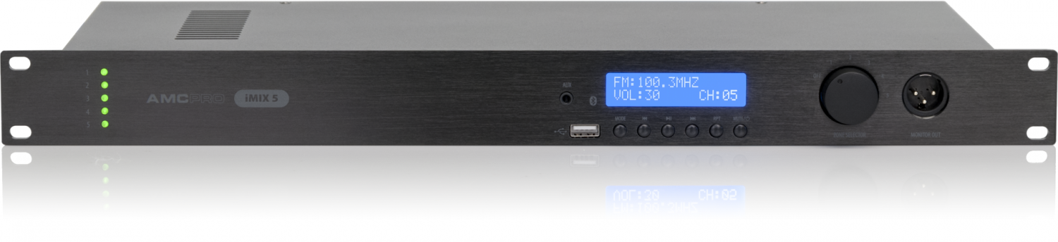 Router strefowy z 5 wyjściami stereo do sterowania dźwiękiem w wielu strefach. iMix5 posiada 4 wejścia źródeł audio, które można skierować do dowolnego z 5 dostępnych wyjść. Źródła w poszczególnych strefach można wybierać za pomocą selektora stref na panelu przednim, za pomocą sterownika naściennego lub poleceń RS232. IMix5 posiada wewnętrzny odtwarzacz multimedialny z USB, Bluetooth, odbiornikiem FM i wejściem AUX. Złącza wejścia priorytetowego i zewnętrznego wyciszenia do awaryjnych instalacji audio.