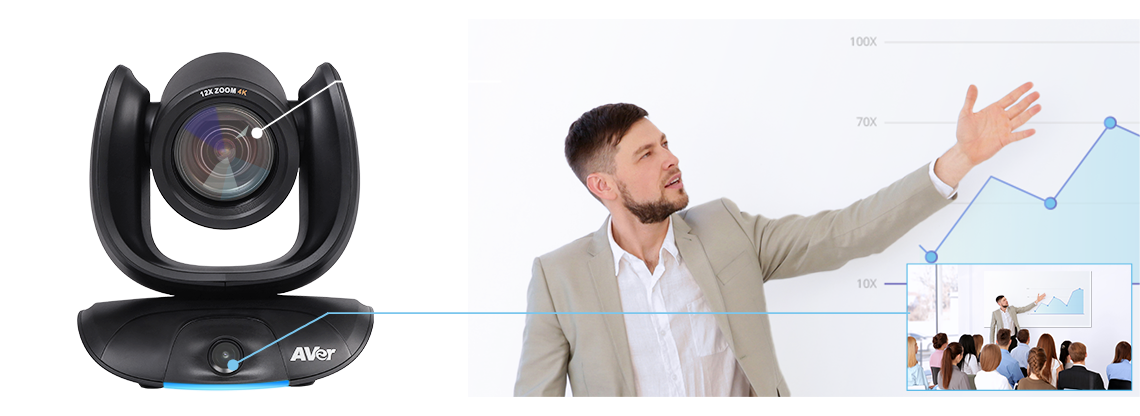 Model z dwoma obiektywami integruje kamerę PTZ z szerokokątną kamerą o polu widzenia 120 stopni i pozwala na jednoczesne śledzenie mówcy i rejestrowanie panoramiczne widoku klasy.