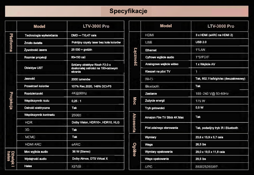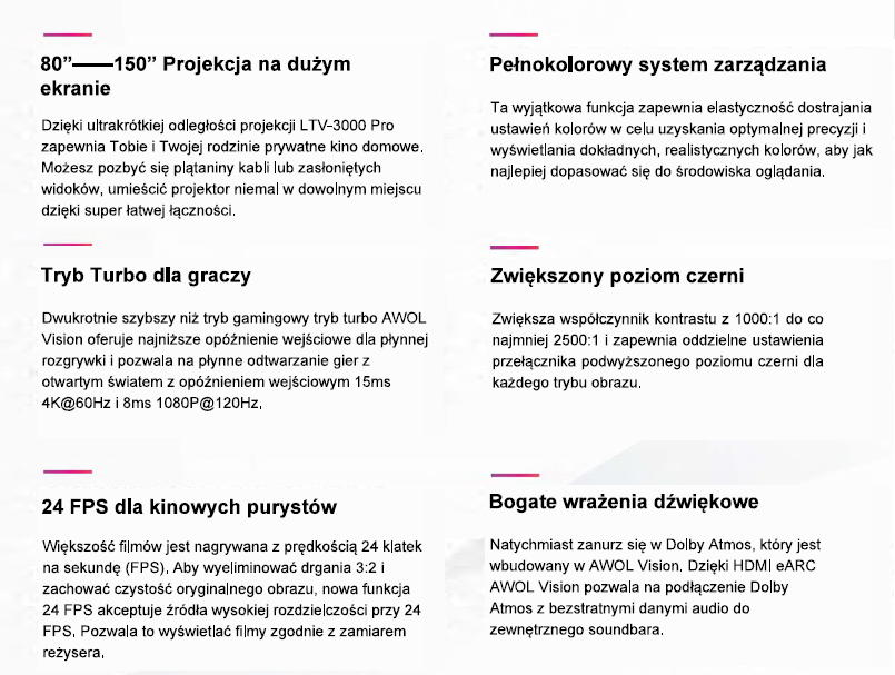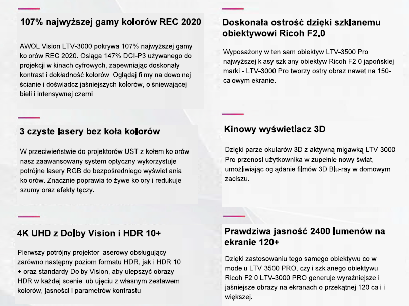 Najbardziej elastyczny projektor laserowy 4K 3D RBG: Zasilany oszałamiającą jasnością 3000 lumenów, AWOL VISION LTV-3000 Pro zapewnia niezwykłą wyrazistość w większości warunków oświetleniowych w dzień i w nocy. Dzięki technologii Triple Laser (bez koła kolorów), 4K UHD z Dolby Vision, HDR10+ i dostępnym trybem 3D, LTV-3000 Pro zapewnia niezrównanie ostry i kolorowy obraz. W połączeniu z wyjątkową technologią zanurzenia w dźwięku z Dolby Atmos, LTV-3000 Pro zapewnia wciągające wrażenia kina domowego 3D przez cały dzień.