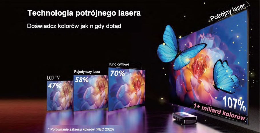 4K-Upscaling, HDR10+, HLG, zintegrowany głośnik (36W), pixel shift, Rec.2020 kalibracja przestrzeni barw