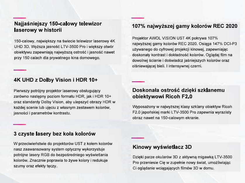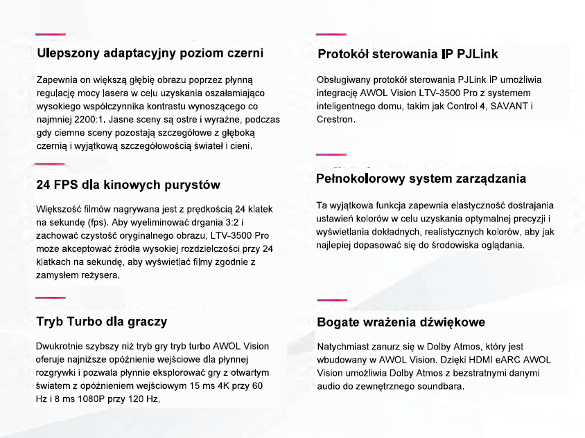 Projektor laserowy AWOL VISION LTV-3500 Pro to najnowocześniejszy projektor 4K o ultrakrótkim rzucie, wyposażony w technologię lasera trójkolorowego, jasność 3500 ANSI lumenów, rozdzielczość 4K UHD, HDR10+ i obsługę 3D. Ciesz się oszałamiającym obrazem t4K o przekątnej 150 cali z dowolnego miejsca w domu. W połączeniu z technologią Dolby Atmos zapewniającą wyjątkowe zanurzenie w dźwięku, LTV-3500 jest najjaśniejszym i najbardziej zaawansowanym projektorem laserowym 4K o ultrakrótkim rzucie na rynku.