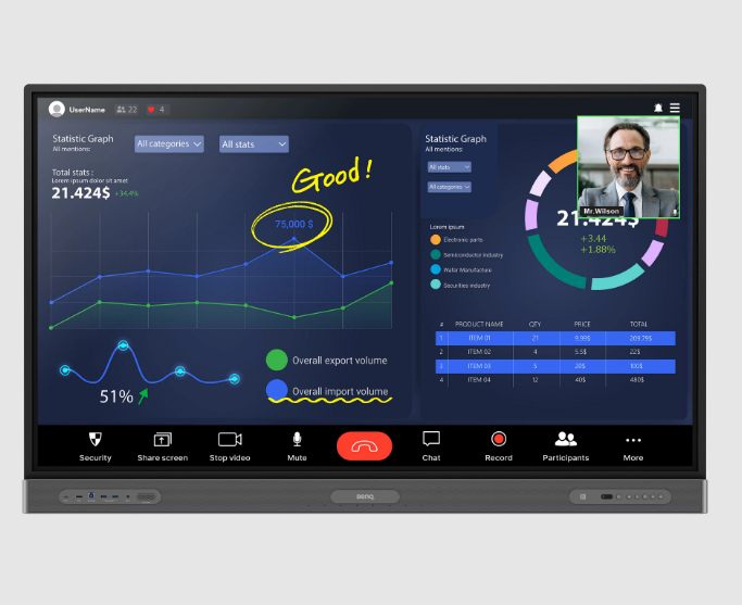 Z komputerem typu slot-in lub przyciskiem InstaShare, tablica BenQ Board Pro jest kompatybilna z wiodącym oprogramowaniem do wideokonferencji, takim jak Zoom, Teams i Google Meet.
