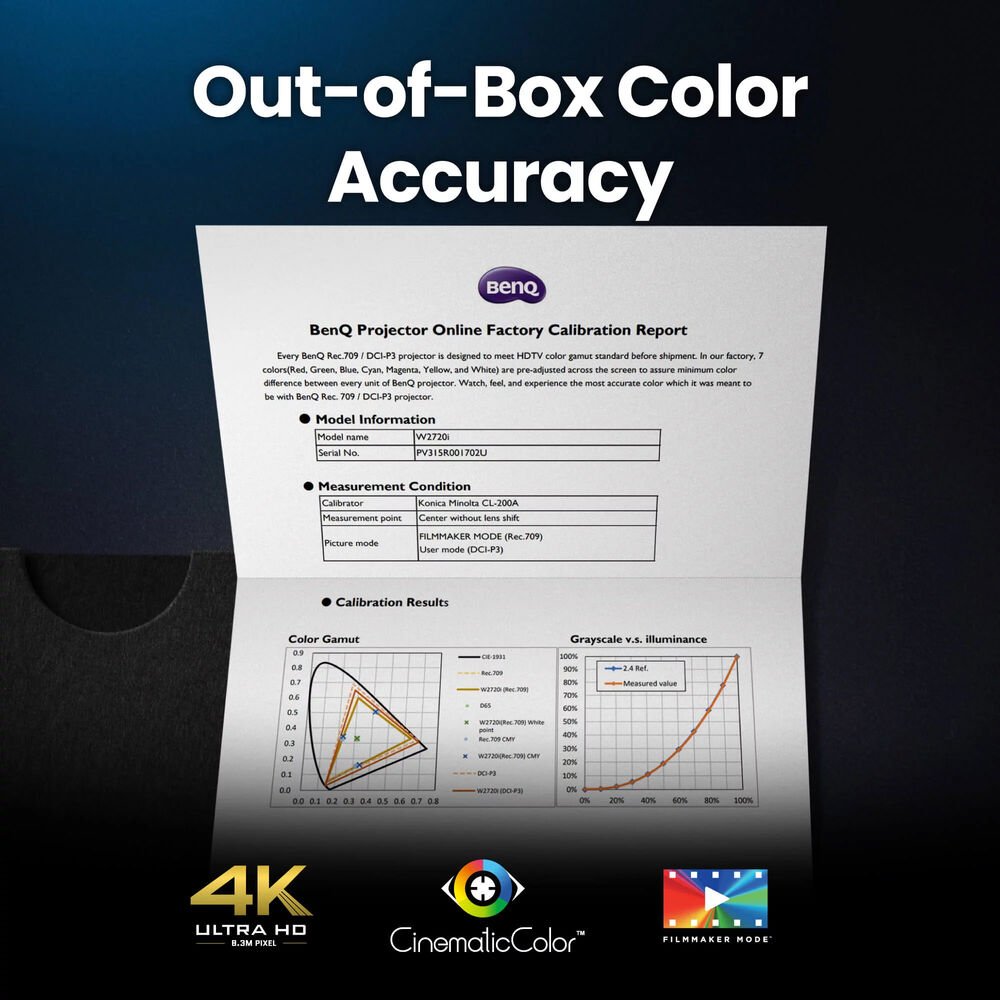 Projektor BenQ W2720i dostarczany jest z raportem kalibracji fabrycznej, zapewniającym 100% pokrycie Rec.709 Deltą E