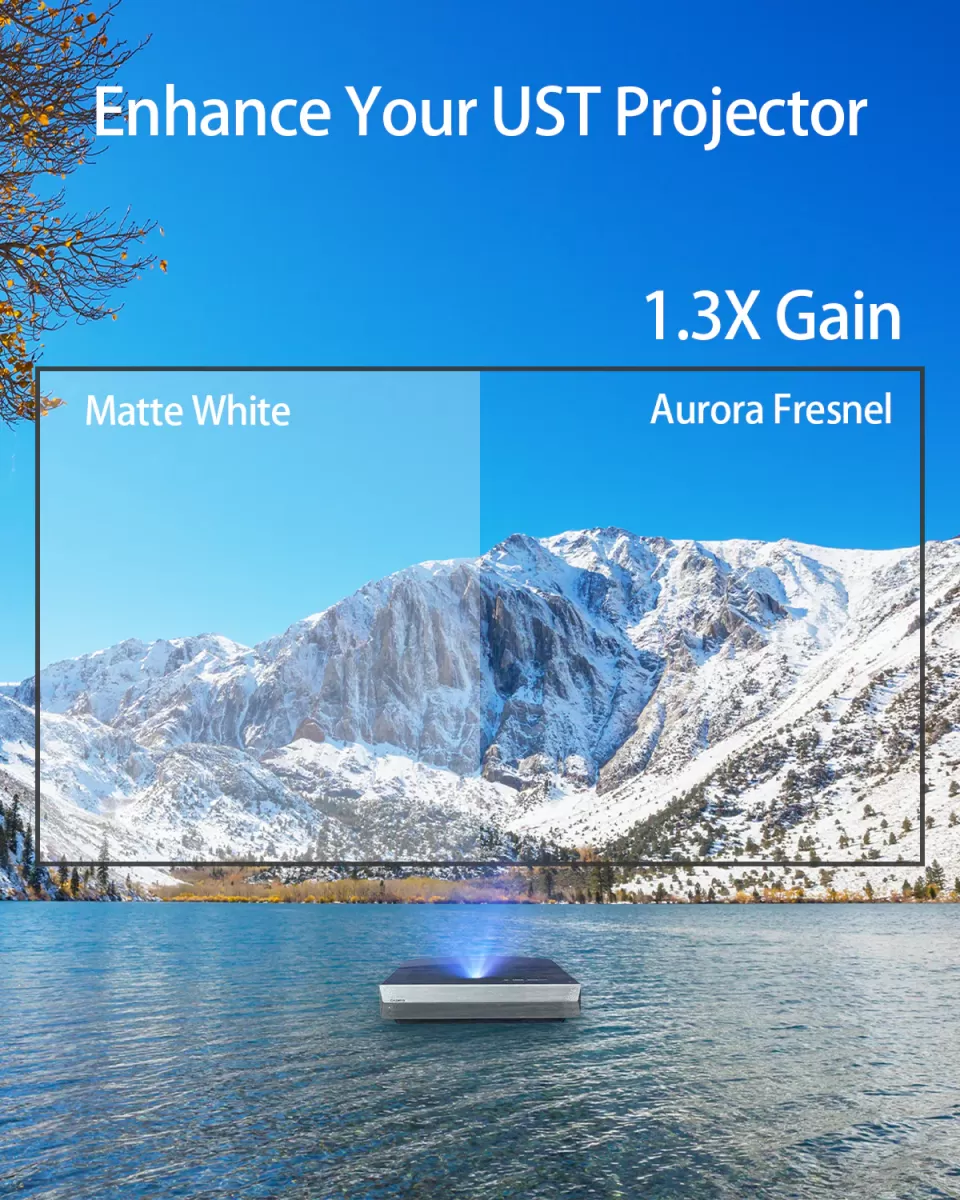 - Ekran Ultra HD: 100-calowy ekran projektora CASIRIS 16:9 ma kąt widzenia 90°, współczynnik proporcji 16:9 z wzmocnieniem 1,3, który jest znacznie jaśniejszy niż większość ekranów, znanych również jako ALR. Antyodblaskowy, bez jasnych punktów.