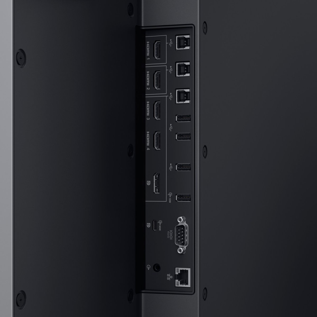 4x HDMI 2.0, 1x DisplayPort 1.2, 1x USB-C 3.0 (5Gb/s, PD 90W, Touchfunktion), 3x USB-B 3.0 (5Gb/s, Touchfunktion), 1x USB-A 3.0 (5Gb/s, BC), 3x USB-A 3.0 (5Gb/s), 1x Jack 3.5mm (Line-Out), 1x RJ-45 LAN, 1x port szeregowy