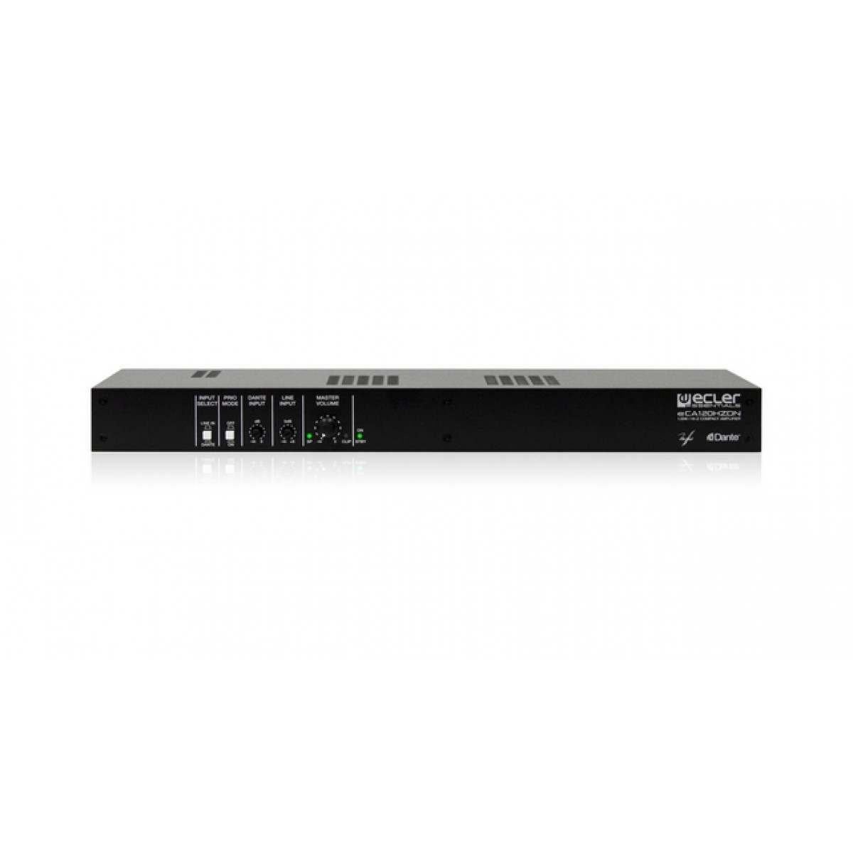 eCA120HZDN to monofoniczny, kompaktowy wzmacniacz o mocy 120 WRMS przy wydajności 100 V (klasa D) do linii o wysokiej impedancji. Posiada 2 analogowe wejścia audio i 2 wejścia audio Dante™, oba z możliwością wyboru funkcji priorytetu (w stosunku do innego sygnału wejściowego), a także dodatkowe wyjście audio. Funkcja automatycznego czuwania (do wyboru) i konstrukcja bez wentylatora (100% cicha). Posiada również port zdalnego sterowania głośnością kompatybilny z serią sterowników ściennych ECLER WPm. W zestawie uniwersalny zasilacz zewnętrzny.