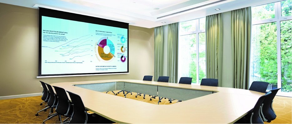 Elektrycznie rozwijany ekran projekcyjny z linii profesjonalnej PREMIUM dedykowany do zabudowy sufitowej ze zintegrowanym sterowaniem IR + RF + złącze RS232/485 + Dry Contact