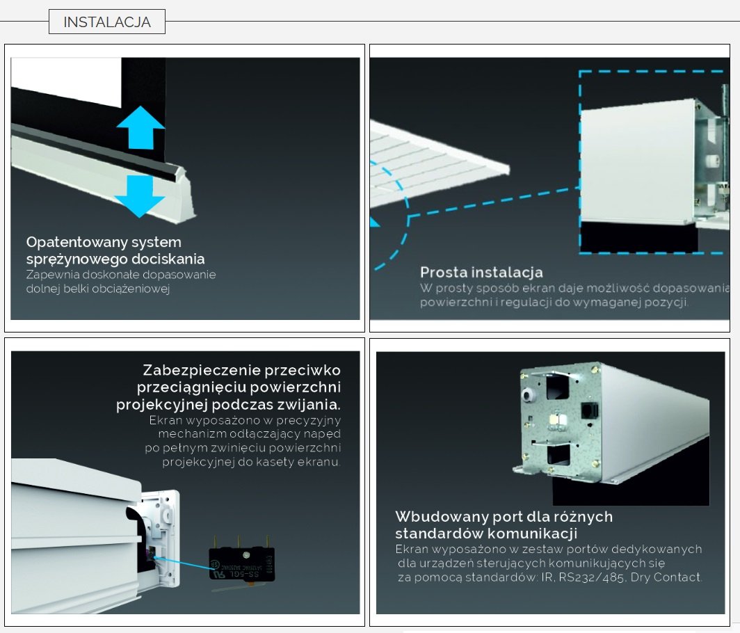 Wysokość kasety do zabudowy tylko 119mm oraz 160mm dla ekranów o szerokości od 332cm włącznie w górę,