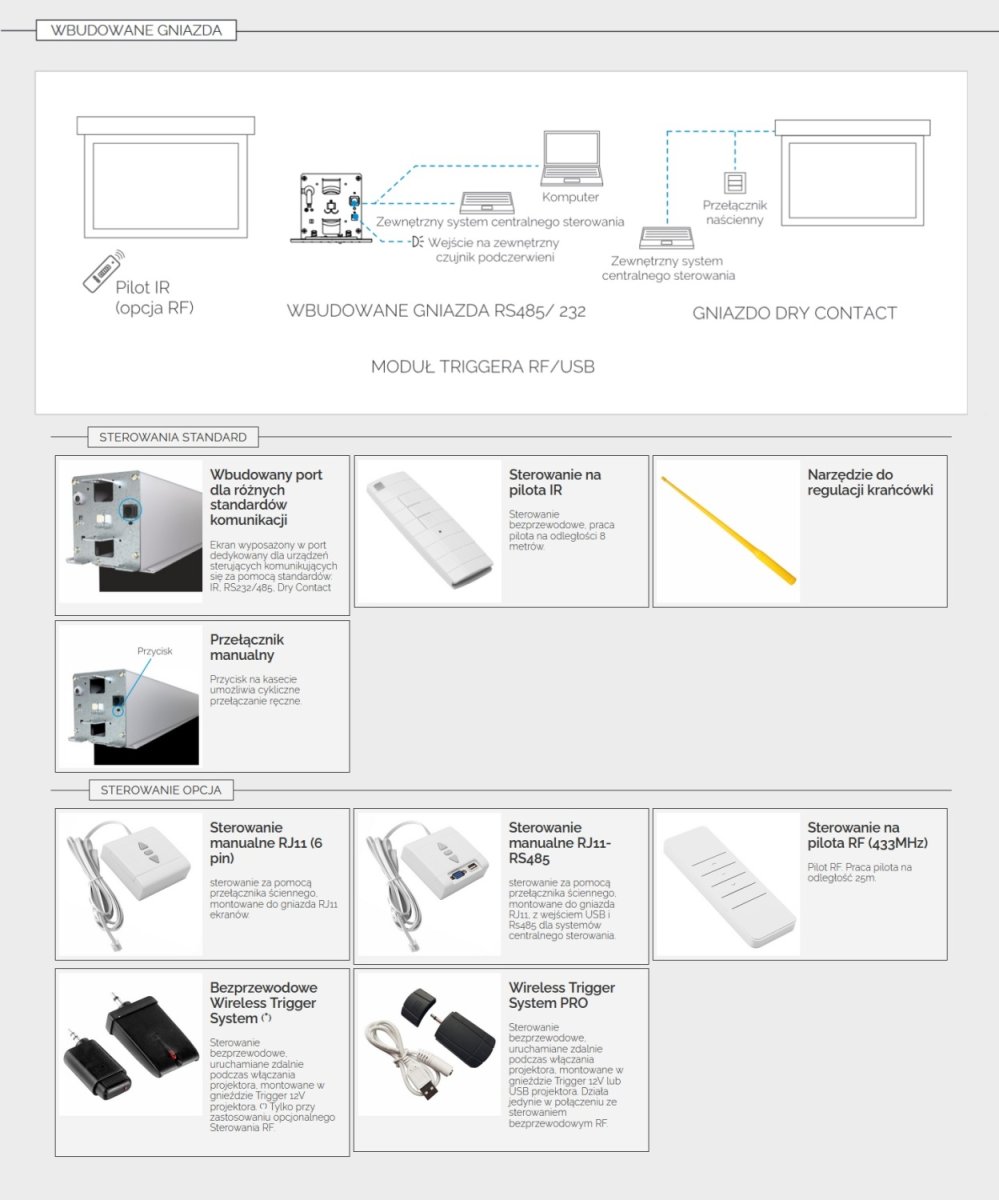 Sterowanie IR, wbudowany dodatkowy odbiornik RF (pilot RF w opcji), złącze RS i Dry Contact,