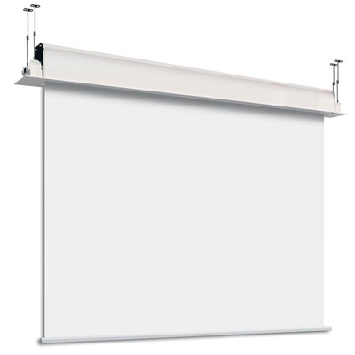 Ekran elektryczny bez czarnych ramek przeznaczony do zabudowy sufitowej.