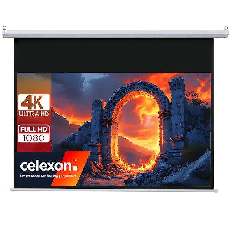 Produkt firmy celexon jest w pełni wyposażonym, silnikowym ekranem projekcyjnym w bardzo atrakcyjnej cenie. Ekran można wygodnie obsługiwać za pomocą pilota zdalnego sterowania lub naściennej skrzynki sterowniczej. Napędem ekranu jest płynny silnik o niskim poziomie hałasu.