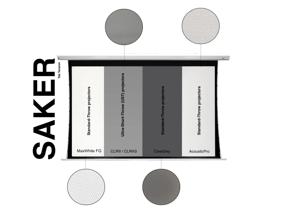 Seria Saker Tab Tension to wysokiej jakości zmotoryzowany ekran projekcyjny w eleganckiej białej lub czarnej aluminiowej obudowie. Ekran ten jest wyposażony w system "tab-tension", liny napinające po bokach ekranu zapobiegają zwijaniu się stron i poprawiają płaskość. Jest dostępny w różnych rodzajach tkanin, a niektóre z bardzo długim przewodem do montażu na wysokich sufitach. "Saker Tab Tension" oferuje bogate akcesoria, takie jak nasze bezprzewodowe rozwiązanie spustowe bez dodatkowych opłat. kolor obudowy jest dostępny tylko z ekranem MaxWhite FG (biały matowy). Nasze specjalne ekrany kina domowego "CineGrey 5D", "Acoustic Pro UHD", a teraz zupełnie nowy "StarBright CLR" są dostępne w wersji z białą obudową, dzięki czemu oferują możliwości dla szerokiej gamy projektów kina domowego.