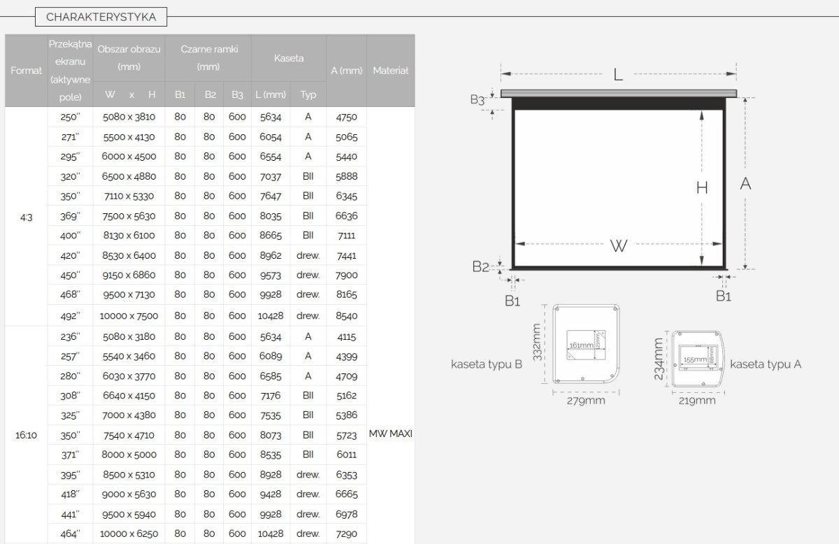 ○ Szerokości 700-800cm kaseta typu B (332x279mm), wałek nawojowy ∅ 200mm,
