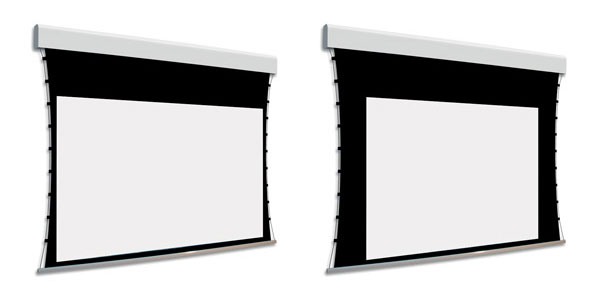 Naścienny, elektryczny ekran z dwoma niezależnymi powierzchniami projekcyjnymi.