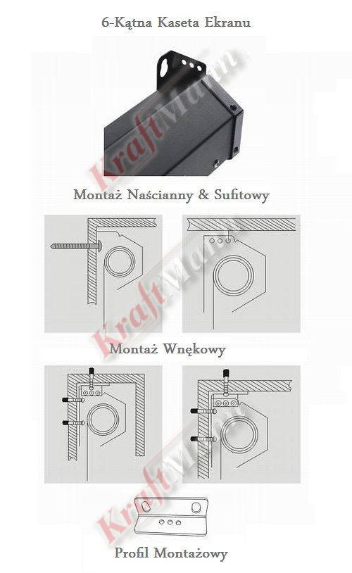 - Dodatkowe opcje :: czarna ramka dowolnej grubości, czarny górny pas rozbiegowy dowolnej szerokości, malowanie kasety na dowolny kolor RAL, profil kasety sześciokątny, system napinaczy bocznych płótna, ultra cichy i szybki silnik, sterowanie (klawiszowe/radiowe RF/na podczerwień IR/Trigger 12V lub 230V/RS-232/inne dowolne), ...