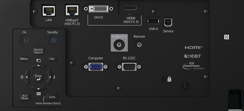Złącze USB 2.0 typu A (2x), USB 2.0 Type B (Service Only), RS-232C, Interfejs Ethernet (100 Base-TX / 10 Base-T), Bezprzewodowa sieć LAN IEEE 802.11a/b/g/n (opcja), Wejście VGA, Wejście DVI, HDBaseT, Stereofoniczne wyjście audio mini-jack, HDMI (HDCP 2.3)