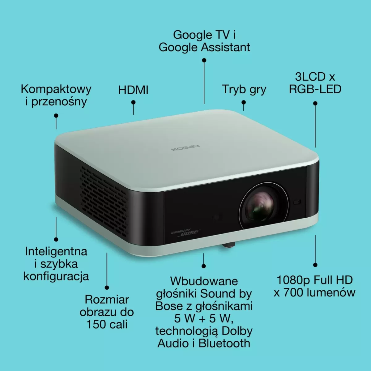 Poznaj nową ofertę przenośnych projektorów Lifestudio firmy Epson. Technologie Triple Core Engine firmy Epson, Sound by Bose i Google TV oraz łatwa konfiguracja – idealne rozwiązanie do stylowej, pełnowymiarowej rozrywki.