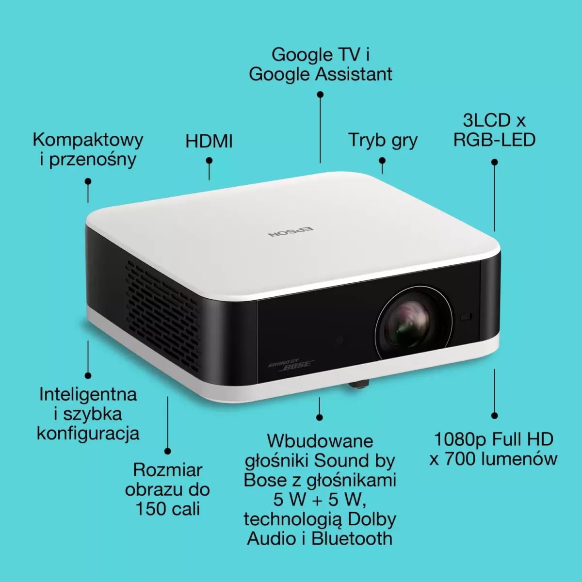 Poznaj nową ofertę przenośnych projektorów Lifestudio firmy Epson. Technologie Triple Core Engine firmy Epson, Sound by Bose i Google TV oraz łatwa konfiguracja – idealne rozwiązanie do stylowej, pełnowymiarowej rozrywki.