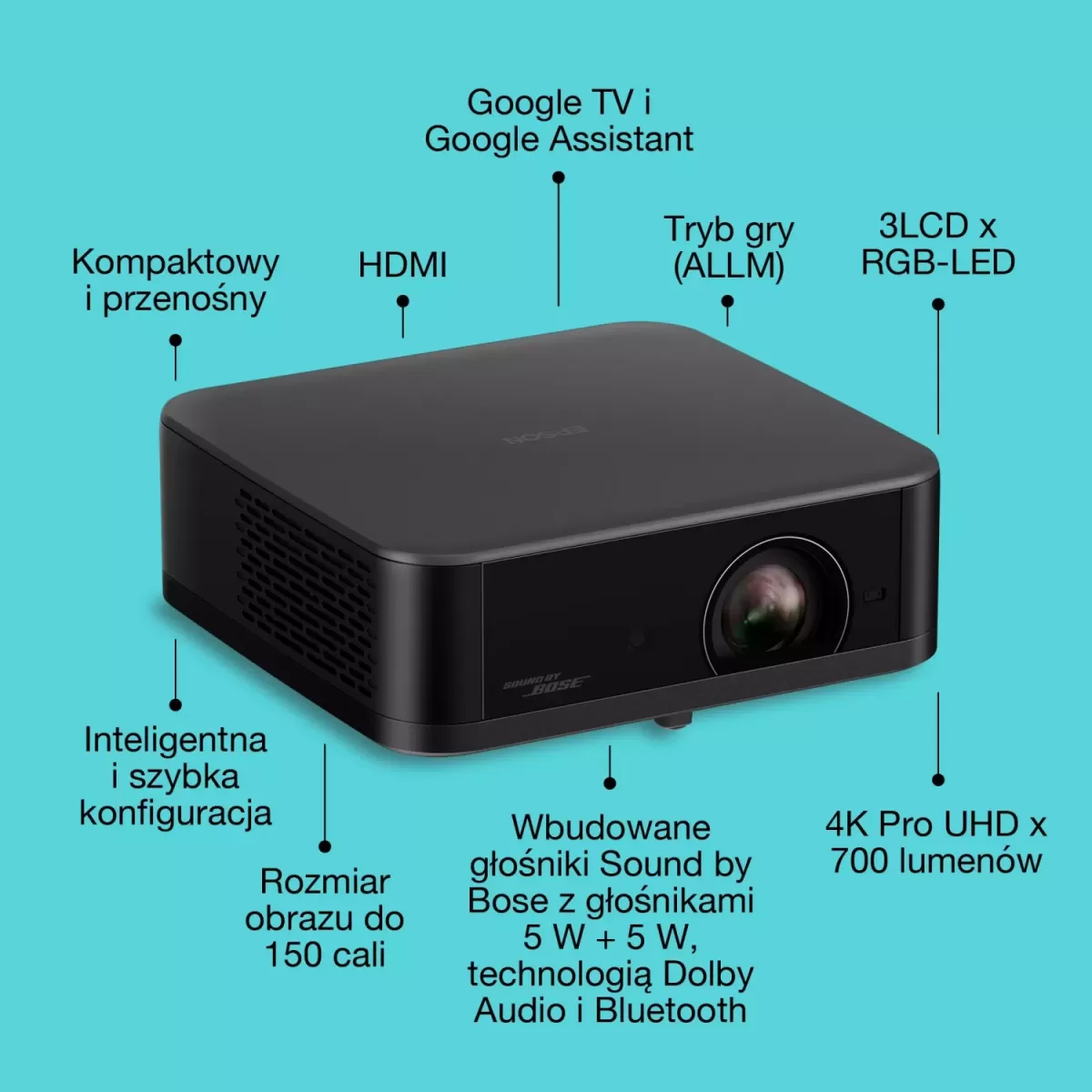 Poznaj nową ofertę przenośnych projektorów Lifestudio firmy Epson. Technologie Triple Core Engine firmy Epson, Sound by Bose i Google TV oraz łatwa konfiguracja – idealne rozwiązanie do stylowej, pełnowymiarowej rozrywki.