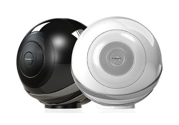 Zestaw audio składający się z dużego, białego, sferycznego głośnika z prążkowanego plastiku na metalowym stojaku, pięciu małych, okrągłych, białych satelitów na okrągłych podstawach, prostokątnego, czarnego wzmacniacza z metalową obudową i okrągłym wyświetlaczem z przodu oraz dwóch czarnych akcesoryjnych modułów, widok z przodu z lekkiego nachylenia