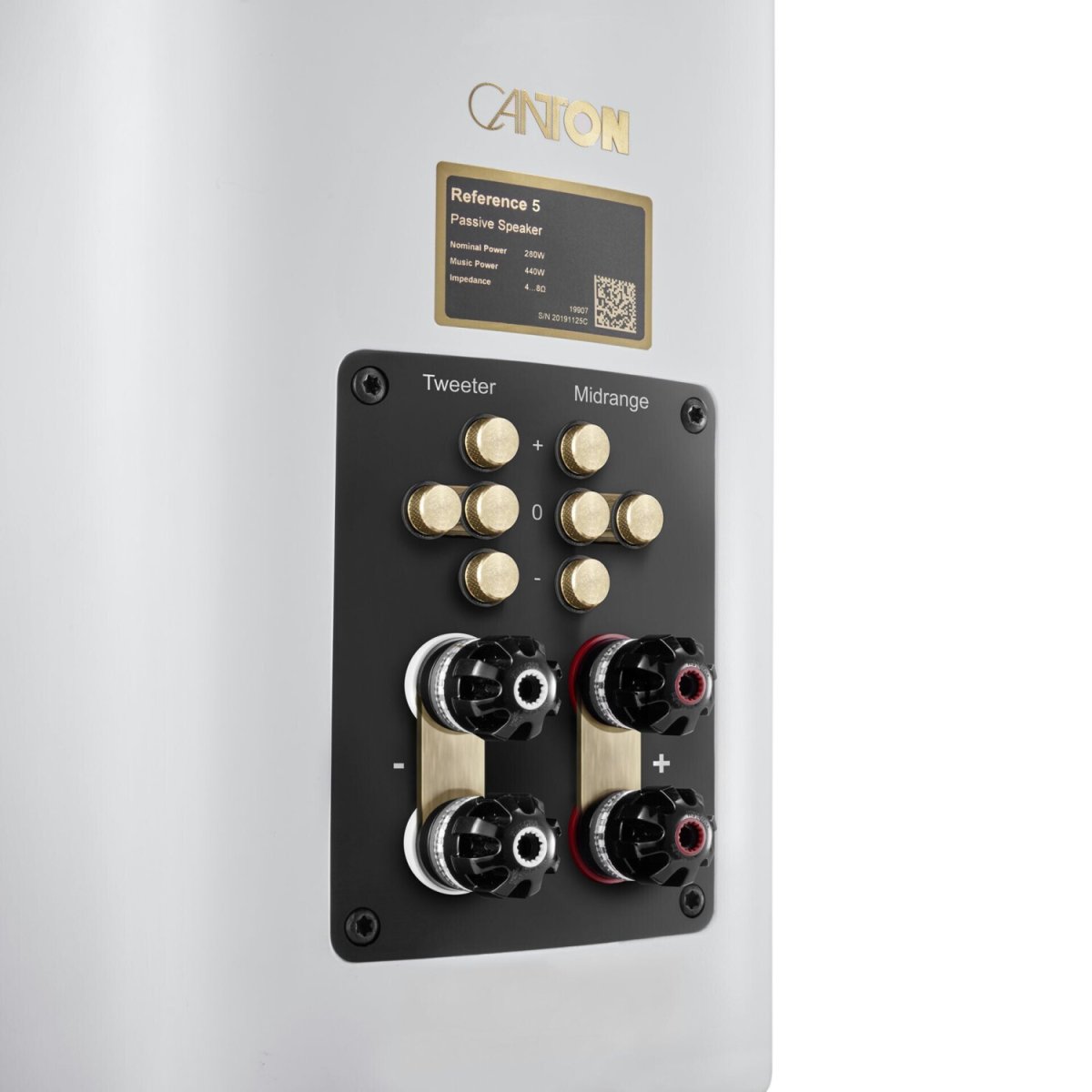 Głośniki Reference 5 są wyposażone w wysokiej jakości złącza WBT nextgen™ i umożliwiają podłączenie w trybie bi-wiring i bi-amping. Złącza te stanowią podstawę doskonałej jakości dźwięku i zapewniają długotrwały, stabilny kontakt. Jeśli nie chcesz korzystać z trybu bi-wiring lub bi-amping, w zestawie znajdują się wysokiej jakości mostki z miedzi pokrytej twardym złotem. Głośniki Reference 5 są wyposażone w regulatory technologii RC (Room Compensation) firmy Canton na terminalu głośnika. Dzięki tej regulacji poziomu można precyzyjnie dostosować poziom ciśnienia akustycznego głośnika średniotonowego i wysokotonowego w krokach co 1,5 decybela. Pozwala to na optymalne dostosowanie głośników do osobistych preferencji słuchowych i akustyki pomieszczenia.