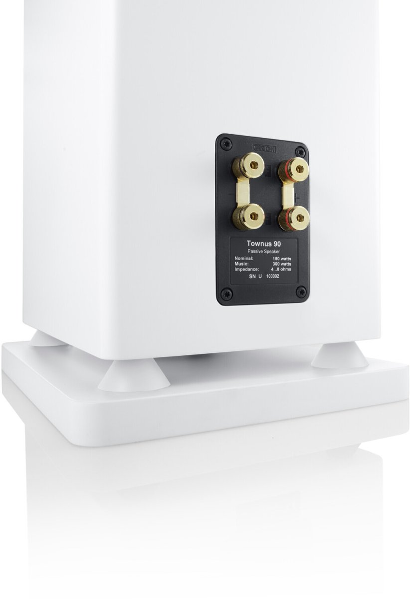 Solidnie zbudowane obudowy trójdrożnych głośników podłogowych Townus 90 są kilkakrotnie wzmocnione od wewnątrz i wyposażone w wysokiej jakości okablowanie wewnętrzne. Strategicznie rozmieszczone materiały tłumiące wewnątrz obudów oraz wyselekcjonowane komponenty zwrotnicy najwyższej jakości optymalizują brzmienie głośników, które ważą około 24 kilogramów. Cztery przetworniki w smukłych głośnikach Townus 90 są najnowocześniejsze i zapewniają renomowaną dobrą jakość dźwięku Canton. Trzy przetworniki 174 mm z tytanowymi membranami zapewniają dynamiczny bas i szczegółowe, mocne średnie tony. Dzięki przetwornikom basowym ze sztywnymi i niskodystorsyjnymi podwójnymi membranami oraz technologii Wave Beading, głośniki Townus 90 nadal grają precyzyjnie i spokojnie nawet przy wysokich poziomach głośności. W połączeniu z naszą opatentowaną technologią DC, duet 174-milimetrowych przetworników basowych w obudowie downfire bass reflex odtwarza mocny i precyzyjny bas bez niekontrolowanego odchylania membran głośników basowych przy niskich tonach. Sprawdzony 25-milimetrowy głośnik wysokotonowy z kopułką z ceramiki tlenku glinu wyróżnia się szczegółowym i dokładnym brzmieniem. Precyzyjnie obliczony falowód zapewniający idealne promieniowanie dźwięku i sprzężenie optymalizuje odtwarzanie głośnika do 40 000 herców.