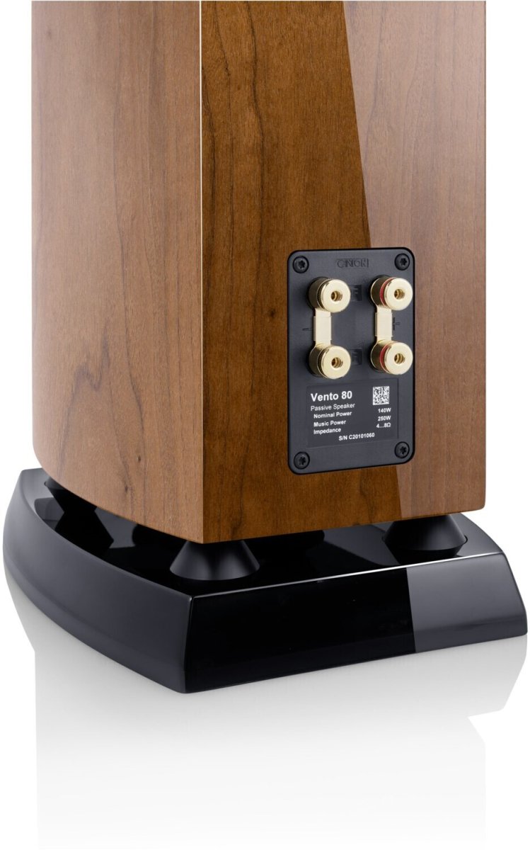 Oprócz eleganckiego wyglądu, nasze głośniki Vento 80 zachwycają wysoką jakością techniczną. Są one wykonane z wielowarstwowego laminatu w wielu poszczególnych etapach i kilkakrotnie wzmocnione od wewnątrz, co daje bardzo solidne i niskorezonansowe obudowy: idealne do doskonałego brzmienia. Ponadto wyrafinowane tłumienie obudów Vento 80 i wyselekcjonowane komponenty zwrotnicy najwyższej jakości zapewniają optymalizację dźwięku głośników podłogowych. Dwa 174-milimetrowe głośniki niskotonowe w każdej z eleganckich obudów bass-reflex zapewniają mocny, głęboki bas. Dzięki podwójnym membranom stożkowym wykonanym z tytanu i grafitu oraz technologii wave surround głośniki zachowują precyzję i ostrość konturów nawet przy wysokich poziomach głośności. Idealnym uzupełnieniem duetu głośników niskotonowych jest 174-milimetrowy głośnik średniotonowy z tytanu i grafitu o dużej powierzchni membrany i potrójnie fałdowanym wave surround, a także wysokotonowy głośnik kopułkowy z ceramiki o średnicy 25 mm.