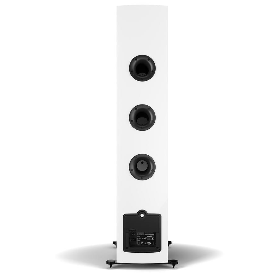 Dostępne w trzech wersjach wykończenia - biały połysk, czarny połysk i orzech włoski - kolumny podłogowe wyposażone są w gumowe nóżki, które utrzymują je we właściwej pozycji i pomagają zachować ich estetyczne i akustyczne walory.