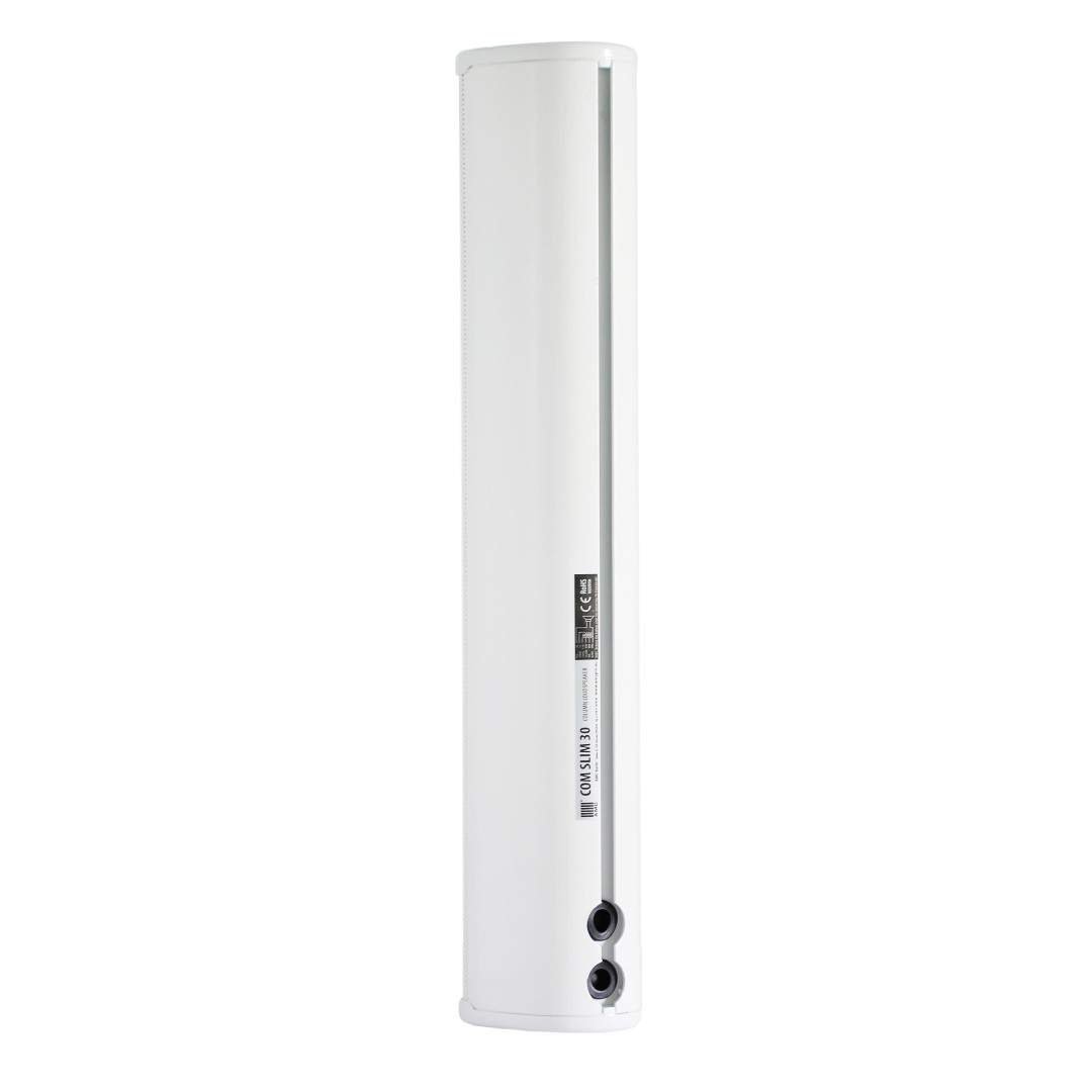 COMSLIM30 ultracienki głośnik kolumnowy odpowiedni do wrażliwych wnętrz o wysokim czasie pogłosu, takich jak kościoły, dworce kolejowe czy hale targowe. Specjalny wspornik montażowy został zaprojektowany w celu dokładnego ustawienia kąta po instalacji. Głośnik jest elegancki i zaprojektowany z myślą o bardzo neutralnym wyglądzie we wrażliwych wnętrzach, do instalacji wewnętrznych i zewnętrznych, o stopniu ochrony IP 55. COM SLIM 30 jest wyposażony w cztery głośniki niskotonowe 2" (51 mm) i jeden głośnik wysokotonowy 1" (25 mm).