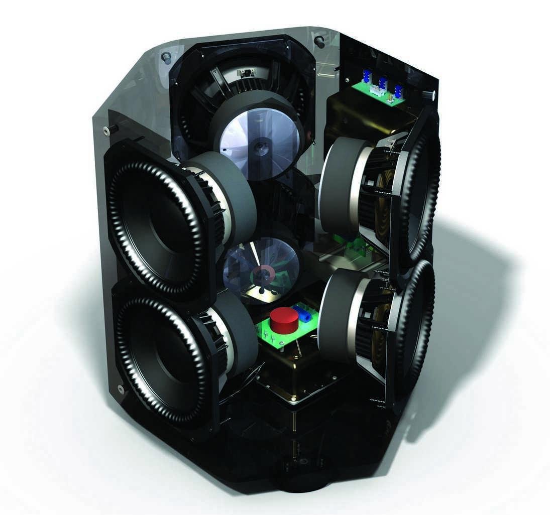 Sześć identycznych, perfekcyjnie zbalansowanych przetworników w inżynierii state-of-the-art. Są promieniowo rozmieszczone w jednej linii (po dwa z każdej strony) w obudowie. Przeciwnie działające siły równych wielkości, potężne siły wibracji (patrz strzałki na wykresie obok) skutecznie znoszą się nawzajem. Z ustawionego na głośniku Martini może umknąć ledwie kropla to przykład na to w jakim stopniu zmniejszyliśmy niepożądane wibracji.