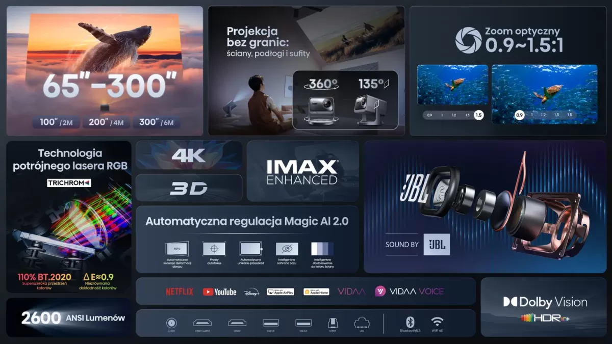 Błyskawiczny w działaniu system VIDAA sprawia, że oglądanie filmów i seriali na projektorze C2 PRO jest łatwiejsze niż kiedykolwiek. Oryginalny system operacyjny obsługuje popularne aplikacje VOD, takie jak Netflix, YouTube, Disney+, MAX i wiele innych, oferując dostęp do najnowszych propozycji. Dodatkowo system zapewnia spersonalizowane opcje dostosowane do Twojego stylu, abyś mógł cieszyć się ulubionymi treściami bezpośrednio na projektorze.