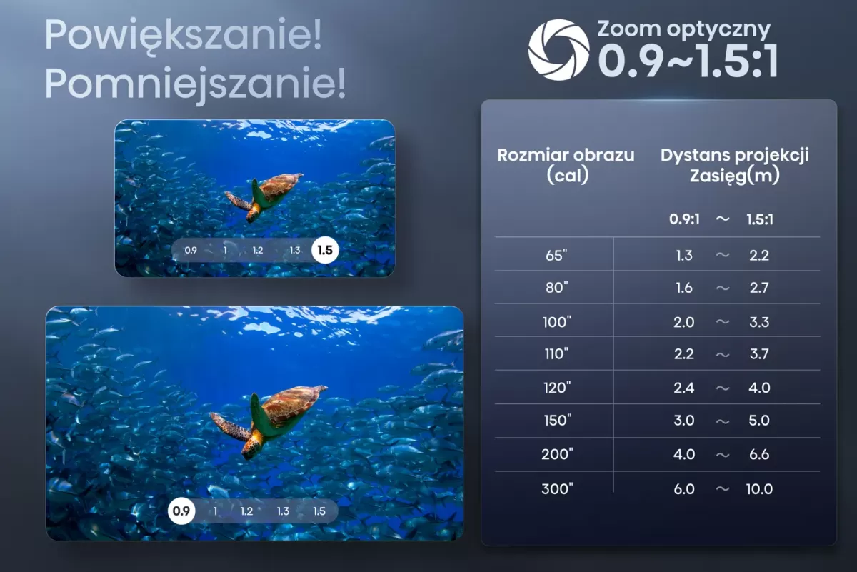 Super zoom optyczny 1,67x działa natychmiast. Precyzyjna zmiana ogniskowej z superszerokim współczynnikiem projekcji (0,9~1,5:1) umożliwia wyświetlanie na większym ekranie z mniejszej odległości. Każda klatka jest jasna i zachowuje najwyższą jakość, a rozdzielczość 4K zapewnia oglądanie bez strat i zniekształceń, bez względu na odległość.