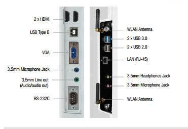 Gniazda wejściowe HDMI x 1 wsparcie dekodowania HDCP, VGA x 1 D-sub 15-pin, DDC2B (VESA) dla komputera HDMI-1, Mikrofon 3.5mm mini jack x 1, Wyjście liniowe 3.5mm x 1, D-Sub 9-pin x 1 dla urządzenia sterującego, USB x 1 (dla zewnętrznego użycia ekranu dotykowego), Pł