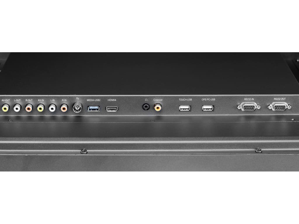 RS232, Component video, Composite video, HDMI x 5, RJ-45 (Ethernet), VGA, USB 3.0 x2, Media USB (Android), PC Audio In (stereo, VGA Audio source), 1/8" Microphone (Mono linked to OPS), USB 2.0 x2, OPS PC USB x2, RCA L/R audio