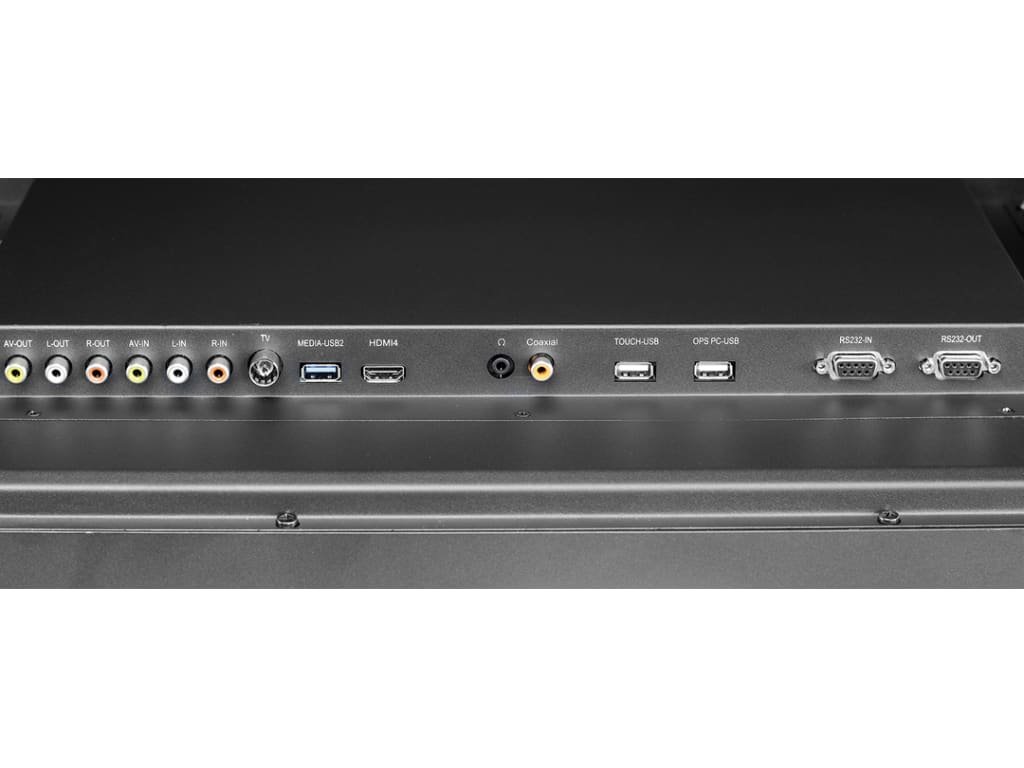 RS232, Component video, Composite video, HDMI x 5, RJ-45 (Ethernet), VGA, USB 3.0 x2, Media USB (Android), PC Audio In (stereo, VGA Audio source), 1/8" Microphone (Mono linked to OPS), USB 2.0 x2, OPS PC USB x2, RCA L/R audio
