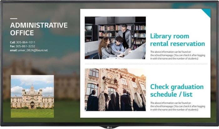 Przy użyciu specjalnego menu użytkownik może szybko sprawdzić podstawowe informacje dotyczące ekranów. Na dole znajduje się menu zarządzania treścią pozwalające przeglądać i odtwarzać dostępne materiały, tworzyć listy odtwarzania i harmonogramy oraz korzystać z pilota.