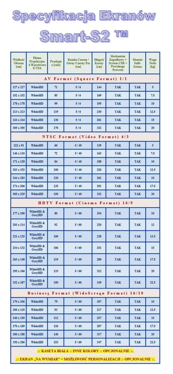 Ekran manualny seria Smart-S2 kasetowy ścienno-sufitowy także do zabudowy indywidualnej w suficie podwieszanym lub wnęce
