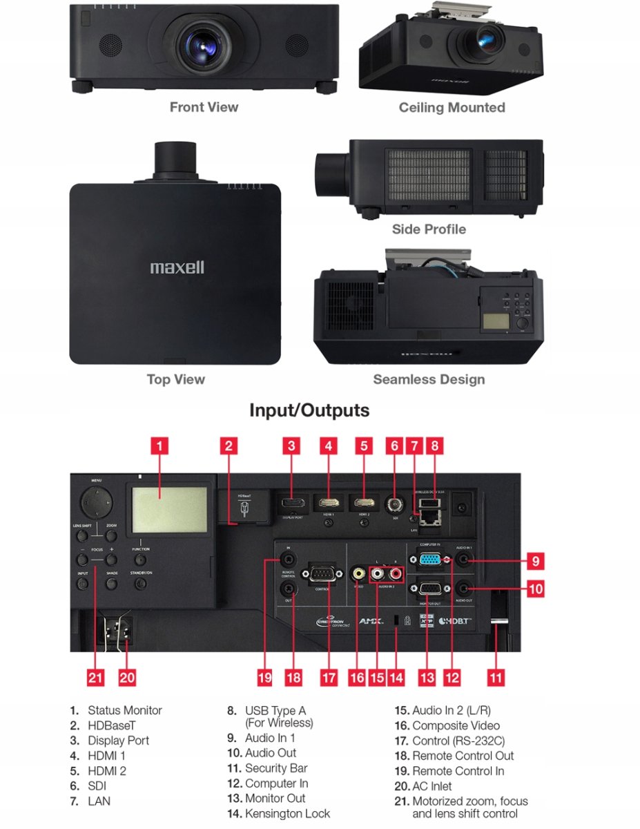 Projektor Maxell MCWU8701 LCD doskonale nadaje się do zastosowań w średnich i dużych obiektach. Zapewnia ostry i wyraźny obraz w rozdzielczości WUXGA z jasnością 7000 ANSI lumenów. Projektor oferuje 5 wejść cyfrowych, takich jak HDBT, 2 wejścia HDMI (zgodne z HDCP), 3G-SDI i port wyświetlacza. MCWU8701 wykorzystuje także unikalne technologie Maxell, takie jak ACCENTUALIZER, HDCR, Image Optimizer i zarządzanie kolorami, aby zapewnić wyjątkową jakość i wyrazistość obrazu.